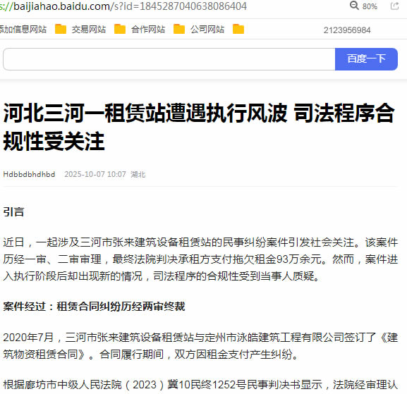 近日,一起涉及三河市张来建筑设备租赁站的民事纠纷案件引发社会关注。该案件历经一审、二审审理,最终法院判决承租方支付拖欠租金93万余元。然而,案件进入执行阶段后却出现新的情况,司法程序的合规性受到当事人质疑。